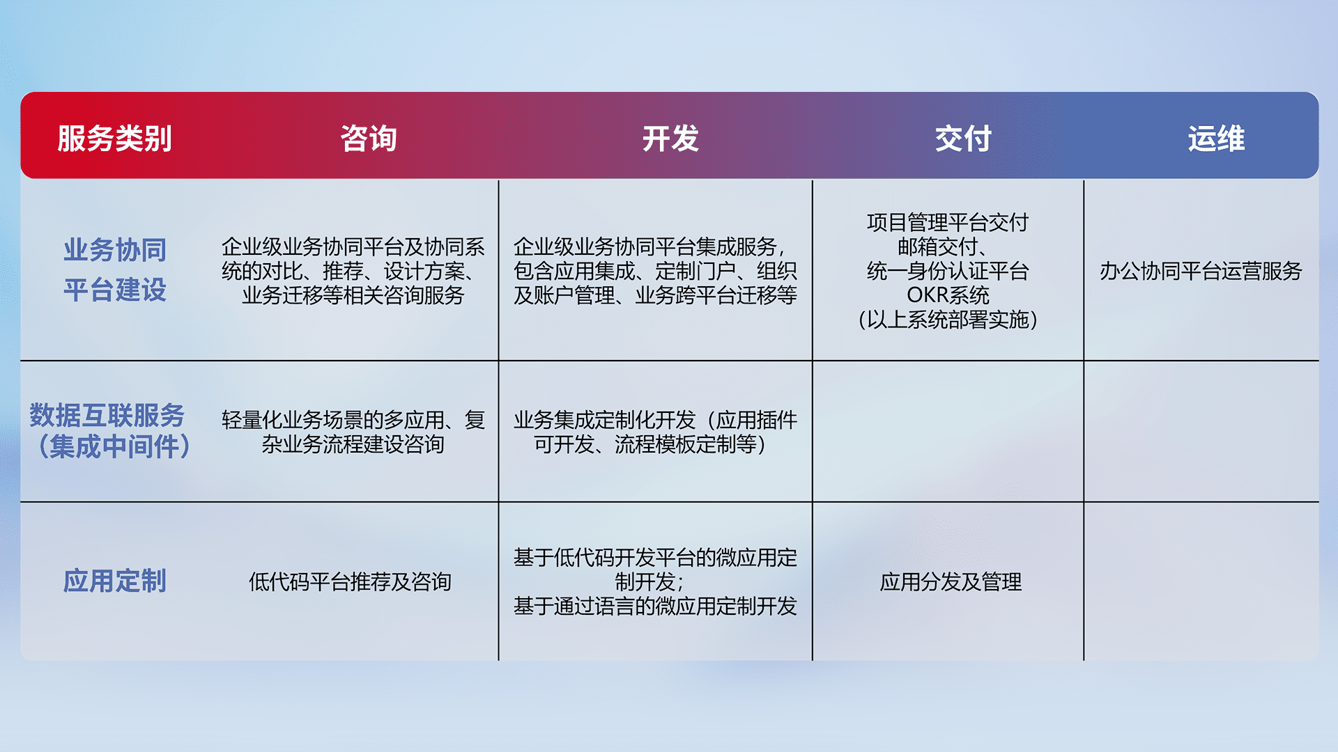 针对钉钉、、企微、、IDaas等平台级产品提供产品的规划、、方案、、、交付、、、、定制化开发等服务,,,,实现如统一协同办公、、智能客户服务、、混合会议管理、、、智能数据查询、、、、等业务场景,,,,实现数字化转型。。。。